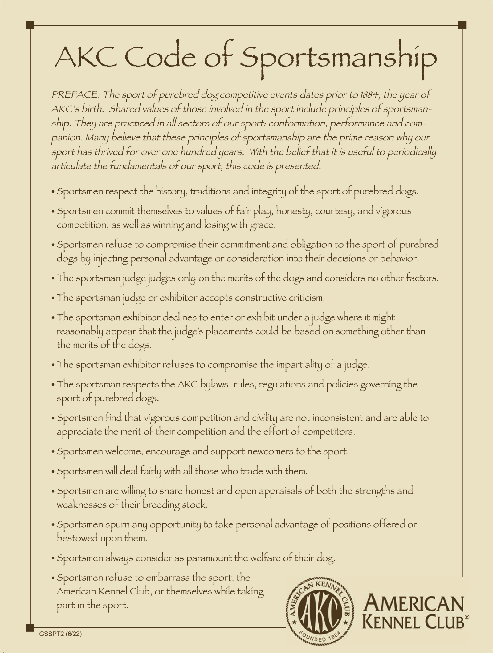 The sport of purebred dog competitive events dates prior to 1884, the year of AKC’s birth. Shared values of those involved in the sport include principles of sportsmanship. They are practiced in all sectors of our sport: conformation, performance and companion.
